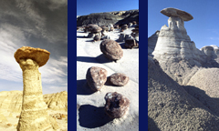 AH SHI SLE PAH BADLANDS Formation Name: FRUITLAND Rock Type(s): Sandstone, Siltstone, Shale, Coal Geologic Time Period: END OF CRETACEOUS Time of Deposition (in millions of years ago): 75 to 73 Depositional Environment: wetlands, swamps, river deltas along a sea retreating to the northeast Common Fossils Found: Petrified wood, crocodiles, turtles, very early mammals, dinosaurs (e.g., Pentaceratops - unique to San Juan Basin- and duck-billed Hadrosaurs) Formation Name: KIRTLAND Rock Type(s): Mostly Siltstone Geologic Time Period: END OF CRETACEOUS Time of Deposition (in millions of years ago): 73 to 70 Depositional Environment: wetlands, swamps, river deltas inland from a sea retreating to the northeast Common Fossils Found: Petrified wood, fish scales, dinosaurs (e.g., T. Rex and last of the sauropods: Allamosaurus) One of three San Jaun Basin badlands carved from the 75-70 million year old Fruitland/Kirtland formation, the Ah Shi Sle PahBadlands at first sight resemble the nearby, much larger Bisti Wilderness. Differences in the topography and color schemes soon become apparent. The layout here is more linear with badlands carved into the southeastern wall of a huge dry wash. Deeply penetrating, side channels form complex branching mazes filled with non-stop hoo doos. The subtle color schemes include banded patterns rendered in alternating grey, black, white, tan, light orange, and olive shades. The Ah Shi Sle Pah showcases the most delicate hoo doo cap rocks in any of the San Juan basin badlands. Gently curving and almost paper thin, many appear poised for flight. The area is rich in dinosaur fossils and petrified upright tree stumps. AH SHI SLE PAH DIRECTIONS — They are best accessed off US 550. Turn west onto County Road 7800 (Navajo 45A) at the Nageezi Trading Post about 46 miles south of Bloomfield or west onto State Highway 57 at Blanco Trading post about 28 miles south of Bloomfield. These two roads both head southwest and converge about 15 miles in, continuing on as State 57 another 3 or 4 miles to the badlands on the north side of the road. There is only one very small, easy to miss BLM boundary marker indicating the two track, half mile route into the parking area. MORE INFO: Call Recreation Specialists Rich Simmon at the Farmington Area BLM Office—505-599-8900