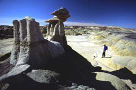 BISTI WILDERNESS Formation Name: FRUITLAND Rock Type(s): Sandstone, Siltstone, Shale, Coal Geologic Time Period: END OF CRETACEOUS Time of Deposition (in millions of years ago): 75 to 73 Depositional Environment: wetlands, swamps, river deltas along a sea retreating to the northeast Common Fossils Found: crocodiles, turtles, very early mammals, dinosaurs (e.g., Pentaceratops - unique to San Juan Basin- and duck-billed Hadrosaurs) Formation Name: KIRTLAND Rock Type(s): Mostly Siltstone Geologic Time Period: END OF CRETACEOUS Time of Deposition (in millions of years ago): 73 to 70 Depositional Environment: wetlands, swamps, river deltas inland from a sea retreating to the northeast Common Fossils Found: Fish scales, dinosaurs (e.g., T. Rex and last of the sauropods, the Allamosaurus) Designated as official wilderness back in 1985, theBisti Wilderness is the second San Juan Basin badland carved from the Kirkland/Fruitland formations. The sprawling 30,000 acre sculpture exhibition offers one of the most entertaining hiking experiences on the planet. A branching dry wash network provides entry to a gargantuan labyrinth beyond description. Never ending hoodoos and brilliant, color combinations overwhelm the senses. Throw in the 50 feet long petrified logs and you’ve got desert rat nirvana. The Bisti Wilderness is the only San Juan Basin badland widely known to the general public outside the region. I published the first national article in 1982 in Sierra Magazine when the fight to save this unique area from coal strip mining was beginning. Congress designated it and the neighboring De Na Zin as official wilderness in 1985. Since then the Bisti Wilderness has been regularly included in travel books, featured in photographic essays and been the subject of numerous magazine articles—some of them mine. BISTI DIRECTIONS —The marked badlands can be accessed via State Highway 371 about 30 miles south of Farmington. Or also from US Highway 550, by first turning west onto County Road 7500 (Navajo 45A) at the Huerfano Trading Post about 15 miles south of Bloomfield, then taking 7500 for 25 miles over to State Highway 371, finally turning north onto 371 and following it several miles to the Bisti marker. A sign marks the turn east onto a few miles of dirt road into a small parking lot. MORE INFO: Call Recreation Specialist Rich Simmons at the Farmington Area BLM Office—505-599-8900