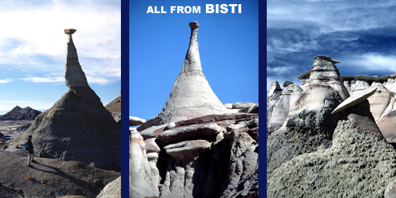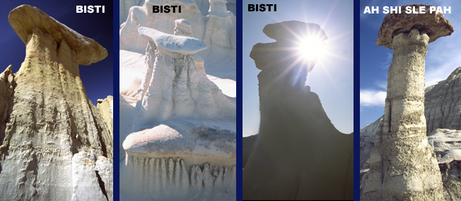 NATURE’S SCULPTURE GARDENS – IMPRINTS OF THE COSMOS Endless hoo doo gardens in the San Juan Basin Badlands never fail to stimulate the imagination. The sheer numbers, infinite variety, evocative shapes, and excessive detail of these natural sculptures invariably lead to the question: What’s the “point?” Why has nature created such an abundance of intricate, whimsical rock forms? Is this “art for art’s sake?” does nature have an inherent aesthetic spirit? Indeed many of the delicately shaped hoo doo cap rocks displayed on pedestals appear as intelligently and purposefully crafted as sculptures from a Santa Fe artist’s studio. Or are the galleries simply huge labyrinths of meaningless, random forms that only the human mind would waste time ascribing purpose to? Another side to the riddle concerns the weirdly organic character of individual shapes and galleries as a whole. You feel you’re walking inside some gigantic cellular structure or sea creature or past the remains of a huge downed monster. Are inanimate processes reflecting a natural life force in the cosmos? Rich treasure troves of animal fossils and petrified wood found all over the San Juan Basin attest to a distant past filled with lush biological communities. Do the baroquely organic hoo doo assemblages carved from raw earth somehow mirror this fecund past? Whether all of this is food for conjecture or just meaningless daydreaming, one thing remains true; these enigmatic forms are imprints of the cosmos itself. Rain, flowing water, wind blown sand, chemical decomposition, and temperature changes have sculpted the hoo doo galleries: but these small scale forces are caused by much grander planetary and even cosmic processes. Galactic gravitational tides, the mega fusion reactor which is our sun, colliding continental plates, our whirling planet and oceans have focused tremendous energies over vast timelines to create the Alice in Wonderland mazes that we muse over. Is it all a joke meant to beguile the human imagination ? Are the badlands evidence for a cosmic sense of humor?