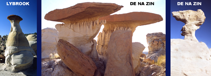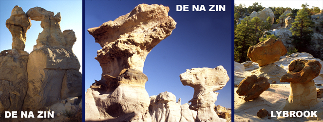 NATURE’S SCULPTING TOOLS Badlands sculpting begins with thick, multi-colored sedimentary layers and gigantic convection currents in the Earth’s molten interior. Melted flowing rock in the deep mantle layer pushes continental sized crustal blocks up far above sea level. In the case of the San Juan Basin, rock once below sea level is now 7000-8000 feet above it. Blocks shatter with giant cracks called faults and continued localized vertical slippage produces mesas and cliff faces. Deep vents allow molten magma to force upward causing more slippage and deformation. The rising, uneven crust is ready for water, empowered by gravity, to begin sculpting as it returns to the sea. Stream channels carve deeper into thick sedimentary layers, exposing new surfaces to the elements. Continued vertical movement along local fault lines adds still more exposed rock for wind and water to carve and shape. As individual rock formations begin appearing, wind blown sand becomes more important in creating hoo doos. Rain and wind work together to carve the characteristic columns, but it is abrasive wind blown sand that shapes intricate hoo doo cap rocks. Surface chemical decomposition involving water, oxygen, and naturally formed acids, weaken rock and hasten the work of water and wind. Chemical reactions also produce diverse mineral hues and complex textures that color formations and enrich their surfaces. High desert temperature extremes cause daily expansion and contraction cycles that mechanically weaken rock and create small cracks where ice wedges form to pry off pieces, helping water and wind over the millennia as they carve strange never ending shapes. Hoo doos form when a more resistant cap rock, much like an umbrella, shields a supporting column from the elements and slows its erosion compared to surrounding material. Wind blown sand shapes and smoothes hoo doo cap rocks into intricate, aerodynamic forms that seemed poised for flight. Occasionally wind completely pierces the hoo doo formation producing various sized arches. Over millions of years all these uplift and erosional forces work together to produce the sprawling, hoo doo filled sculpture gardens that are the San Juan Basin Badlands.