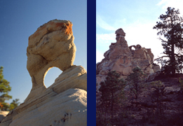 Formation Name: NACIMIENTO Rock Type(s): Sandstone alternating with Siltstone and Shale Geologic Time Period: TERTIARY-- MIDDLE PALEOCENE Time of Deposition (in millions of years ago): 65?, 64? to 58 Depositional Environment: Branching river systems and large flood plains Common Fossils Found: petrified wood, fish scales, early mammals (e.g., primates, dog-sized early hoofed varieties) The Lybrook Badlands are the largest of the Nacimiento formation badlands dropping over 700 feet in 3 distinct, multi-colored, intricately eroded stair steps. Extensive vertical relief and towering buttes lend grandeur reminiscent of Bryce Canyon. These rarely visited but highly accessible badlands rival the well known Bisti Wilderness in size and surpass it in the diversity of both hoodoos and vegetation. Ancient Juniper roots claw at naked cliff edges anchoring huge sinuous trunks which flow and curve like the finely drawn sandstone layers from which they grow. Forests of twisting, branching bonsai ponderosa clutch at jagged mesa walls. The endless Lybrook hoodoos feature precariously balanced, brilliant red cap rocks so ingenious looking that it’s difficult to believe they’ve been created by the random interactions of natural forces instead of in a Santa Fe sculpture studio. LYBROOK DIRECTIONS -- Lybrook Village lies about 35 miles northwest from Cuba or 50 miles south of Bloomfield on US 550. The badlands turnoff off 550 is about .7 miles north of the Lybrook Mercantile Store. Turn left onto the dirt route and travel south about 1.5 miles to a small road branching right. Take it for 50 yards to a junction. You have two choices here depending on which section of the badlands you want to access. Turn left for a half mile route to the parking area. Then head for the cliff edge and find the tricky way down or turn right and continue for 2 miles past another junction to a left turn and much easier entry into the badlands. MORE INFO: Call Recreation Specialist Rich Simmons at the Farmington Area BLM Office—505-599-8900 |